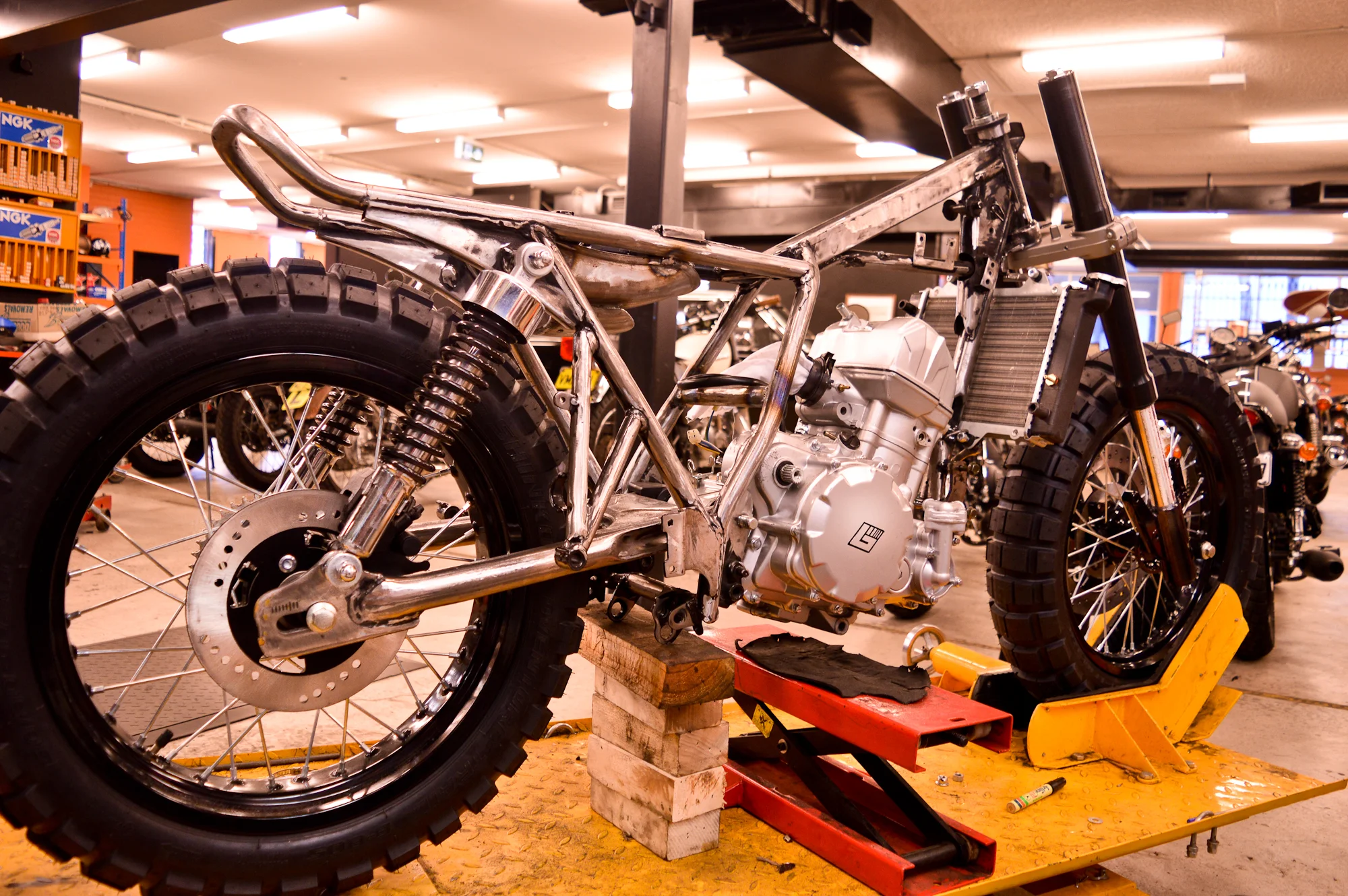 Progress on the Braaap build for the 2015 Throttle Roll. Big thick knobbly tyres have gone on and frame modified to hold the 450cc engine. The beast emerges.